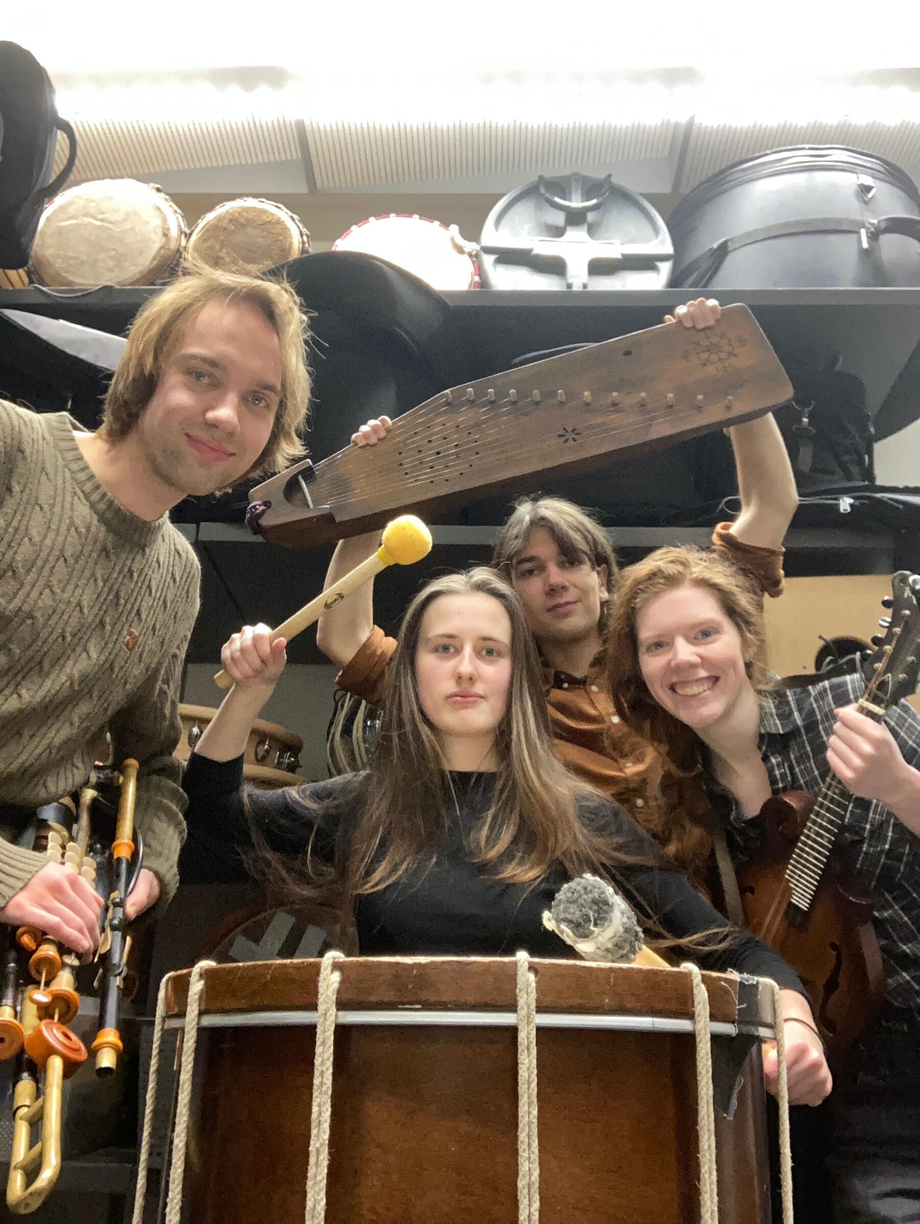 The core band consists of Heikki Kylkisalo (Finnish; uileann pipes, guitar, whistles), Jadviga Mežniece (Latvian; kokle, whistles, vocals), Felix Hirsch (German/Swedish; bodhran, cello, flutes, whistles, banjo), Lauris Frelis (Latvian; percussion and dance instruction), and Adrian Montclaire (USA; vocals, mandolin, songwriting, admin work/writing up the nonsense you’re reading right now.) Many of the members are current or former students of Finland’s world-renowned Sibelus Academy, and they are all massive nerds.The band's name comes from a little-known Finnish word—an ‘astalo’ is a bludgeoning weapon, especially an improvised bludgeoning weapon that usually has some other purpose, such as a frying pan or a steel folding chair. Even though medieval music is not expressly designed for hitting, Astalo aims to smack you in the face with it all the same!